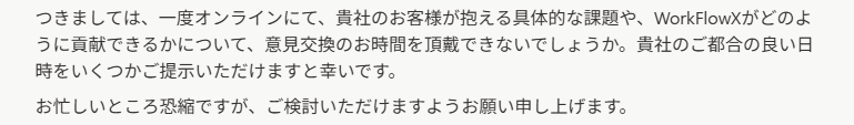 Webサイトから読み取れる課題感やニーズをもとに、それを提案理由として論理的に組み立てた営業メールになっています。