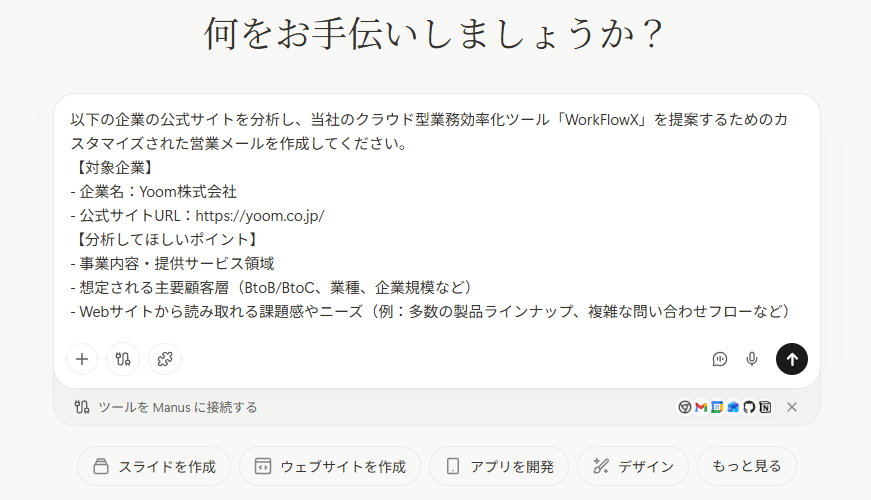 Manusは対象サイトから事業の核を的確に把握し、単なるテンプレートではない、相手企業に深く刺さる独自の文面を生成しました。