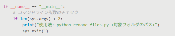 特筆すべきは、単にリネーム機能だけでなく、コマンドライン引数が不足している場合や、指定されたパスがディレクトリではない場合などの「エラー処理」が標準で組み込まれている点です。
