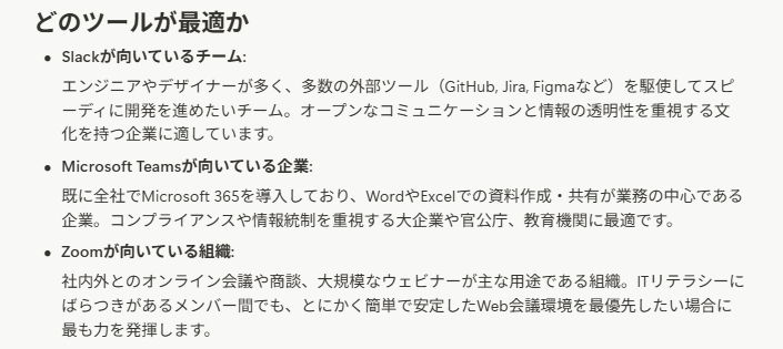 また、最終的に「どのツールが最適か」までの落とし込みもあり、リサーチ業務におけるタイムパフォーマンスを劇的に向上させる実力を確認しました。