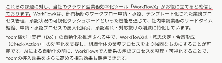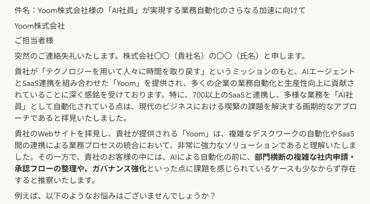 より高度な「コンテクストを汲み取ったアウトプット」の精度を確かめるため、特定企業の分析に基づいた営業メールの作成を依頼しました。