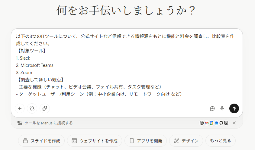 具体的には、競合する3サービスを対象とし、公式サイト等の信頼できる情報源から「主要機能」「ターゲット」「料金プラン(課金単位含む)」「無料トライアルの有無」「日本語対応」「強み・弱み」を網羅した比較表の作成をManusに依頼します。