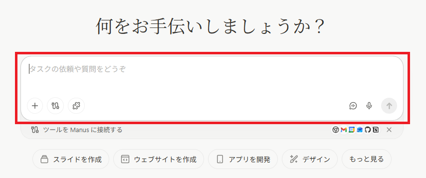 このチャット欄にプロンプト(指示)を入力・送信するだけで利用開始できます。