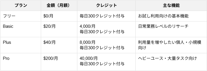 初めて利用するユーザーには、初回登録時に1,000クレジットが無料で付与されるため、まずはその範囲内で様々な機能を試すことができます。また、無料プランであっても毎日300クレジットが自動的に補充される仕組みになっているため、日常的なリサーチやメール作成などの軽いタスクであれば、継続的に無料で活用し続けることも可能です。