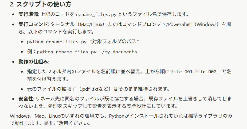 さらに、非エンジニアでも迷わず実行できるよう、コマンドの叩き方や注意点が丁寧な箇条書きで添えられていました。業務フローの自動化を強力にバックアップする「優秀なプログラミングアシスタント」としての実力を十分に発揮しています。
