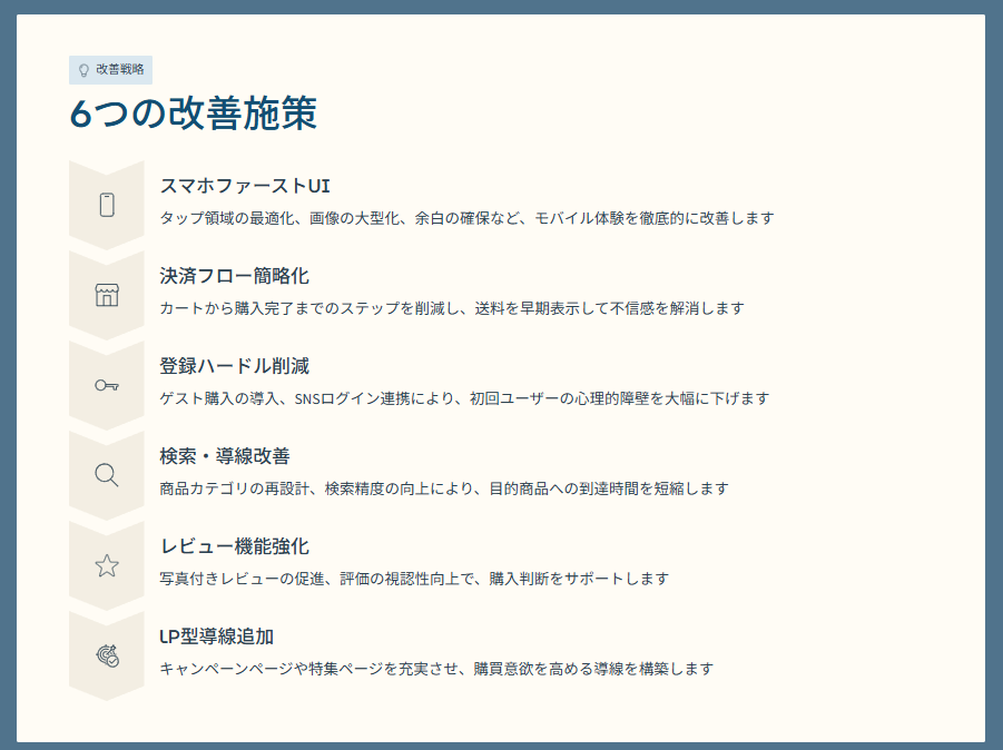 メモ段階の「スマホファースト」や「UI改善」といった抽象的なキーワードが、スライド上では説得力のある見出しとして具体化されました。