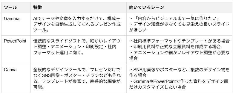 従来から使われているPowerPointやCanvaと比較し、特徴・向いているシーンの違いは以下です。