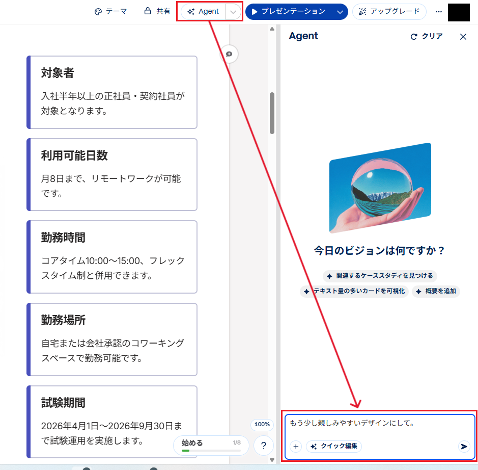GammaのAI Agentは、デザインの「空気感」を言語で理解し、一括で反映させる能力において極めて優秀です。