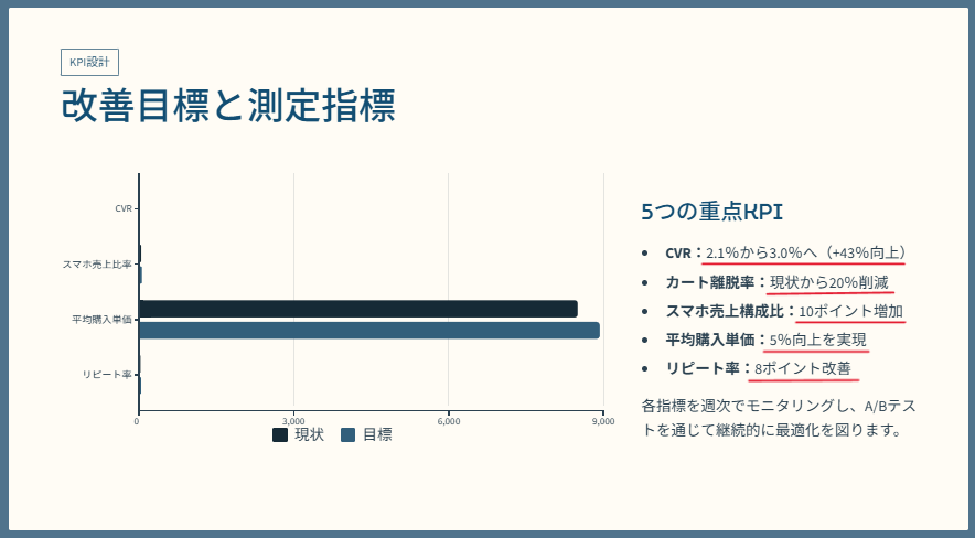 「CVR 2.1% → 3.0%目標」「カート離脱率20%削減」といった重要なKPI数値や、「〜3月:要件整理」「7月:本番反映」といった数値のデータが一字一句漏れることなく適切なスライドに反映されました。