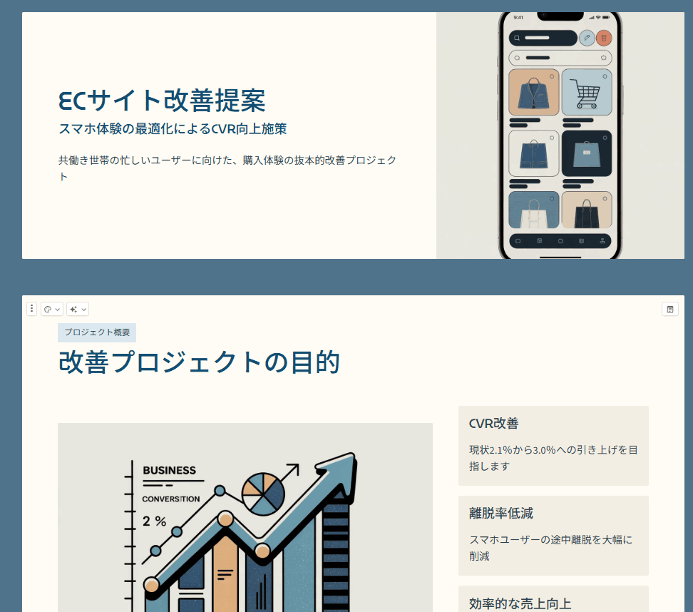 構成案の作成からデザインの調整までをAIが肩代わりしてくれるため、ユーザーは「何を伝えるか」という本質的な部分に集中できます。