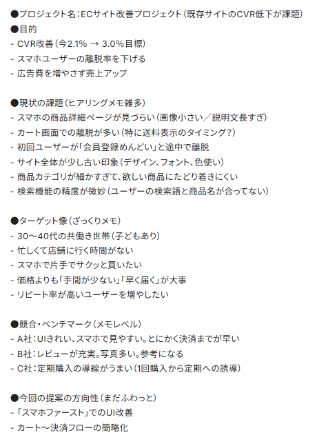 「CVR 2.1%から3.0%への引き上げ」という具体的な数値目標から、「会員登録がめんどい」といったユーザーの生の声、さらには「開発リソースが厳しい」というクライアントの懸念点まで、あえて粒度をバラバラに詰め込んだ約1,000文字のテキストを用意しました。