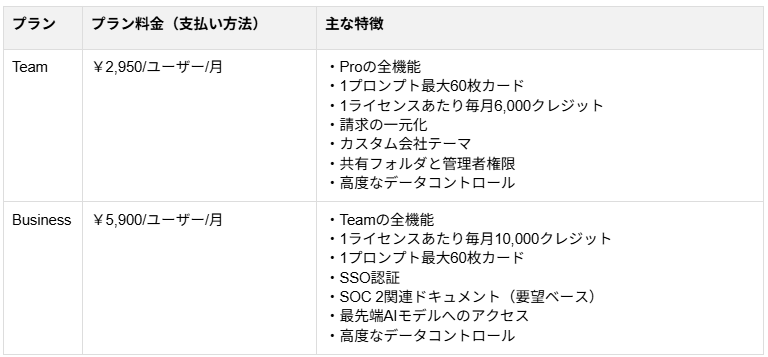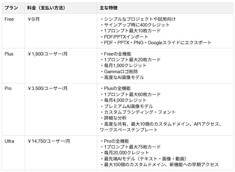 Gammaの料金システムは、大きく「個人向け」と「チーム向け」の2系統に分かれ、その中で月額・年額とクレジット量・機能が段階的に上がる構造になっています。