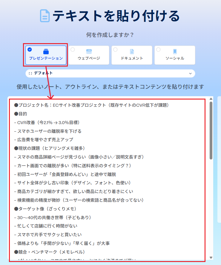 このテキストメモを「Paste in text(テキストを貼り付け)」機能にそのまま貼り付け、生成を行います。