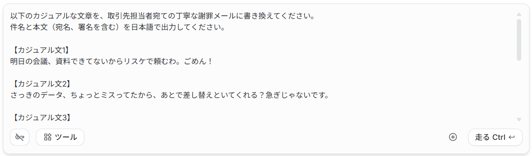 検証1:カジュアルな文章をビジネスメールに変換 まず、システム指示に「礼儀正しい日本のビジネスマン」という役割を与え、取引先に対して失礼のない、かつ簡潔で自然なメールを作成するよう定義しています。
