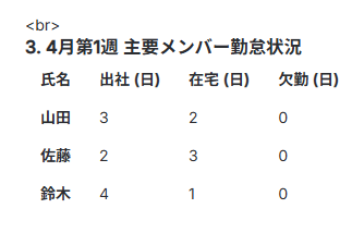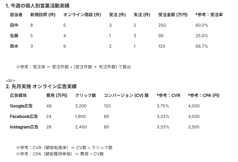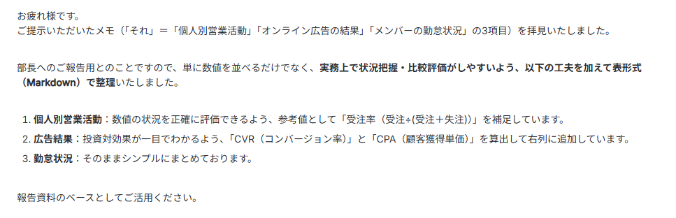 情報が混ざることなく、「1. 個人別営業活動実績」「2. オンライン広告実績」「3. 勤怠状況」と論理的な塊ごとに3つのMarkdownテーブルに分割。 部長がパッと見て状況を把握できるよう、視認性の高い構成を構築 しました。