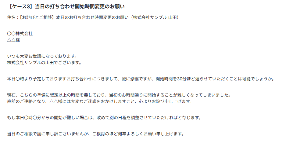 【ケース3】 「今日の打ち合わせ、こっちの準備がバタバタで、開始時間30分ずらしてほしいです…。すみません…。」 変換後▼ 準備不足を素直に認めつつ、「心よりお詫び申し上げます」といったビジネスシーンで妥当な最上級の謝罪表現を適用。