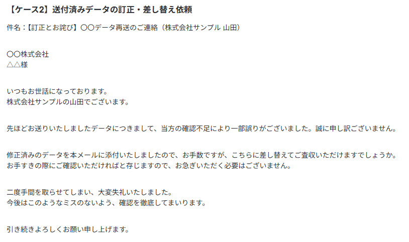 【ケース2】 「さっきのデータ、ちょっとミスってたから、あとで差し替えといてくれる?急ぎじゃないです。」 変換後▼ 「急ぎではない」というニュアンスを汲み取りつつ、相手の手間を考慮した、角の立たない依頼表現へと変換。