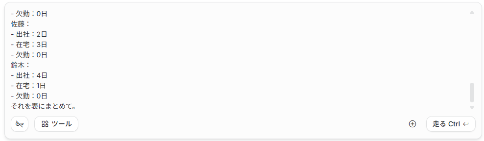 検証結果 最後の一文「それを表にまとめて。」という短い指示に対し、直前の勤怠データだけでなく、提示された「個人別営業活動」「オンライン広告の結果」「メンバーの勤怠状況」の3項目すべてを対象であると正確に認識 しました。 情報を切り捨てることなく、全体を俯瞰した処理を行っています。