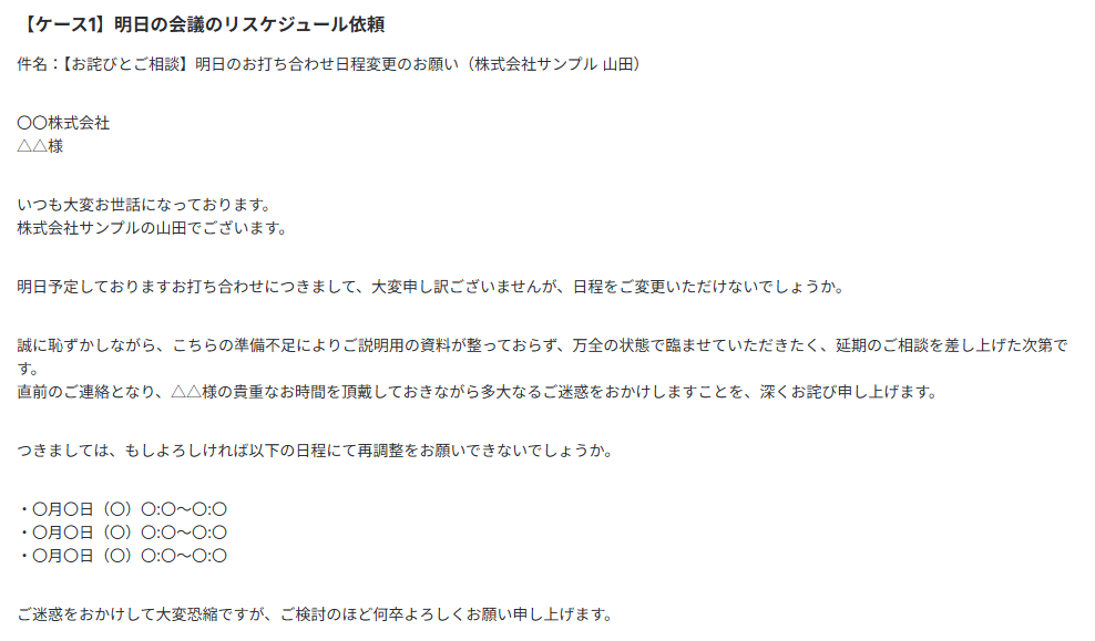 【ケース1】 「明日の会議、資料できてないからリスケで頼むわ。ごめん!」
