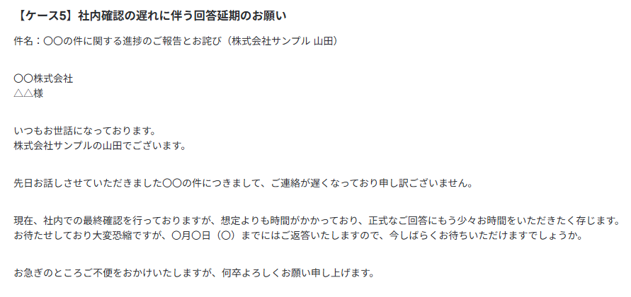 【ケース5】 「この前話してた件、社内の確認がまだ終わってなくて、返事ちょっと待ってもらえると助かります…。」 変換後▼ 二重敬語や「させていただく」の多用といった不自然な敬語を避け、プロのビジネスマンが書くような簡潔な文章を生成。