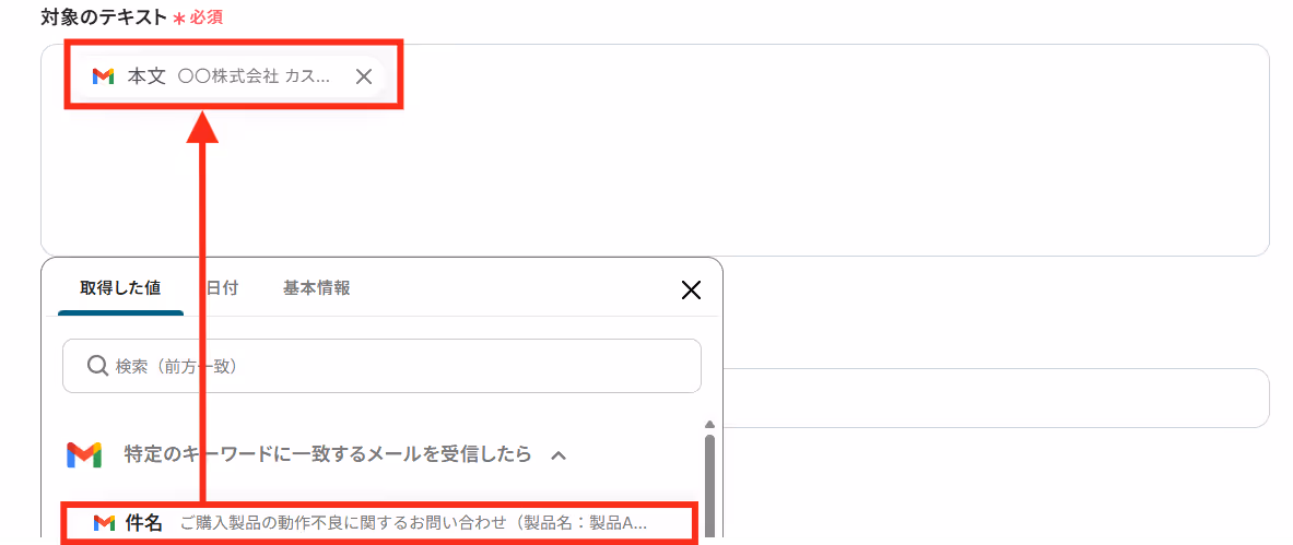 抽出したい「対象のテキスト」を「取得した値」から設定しましょう。