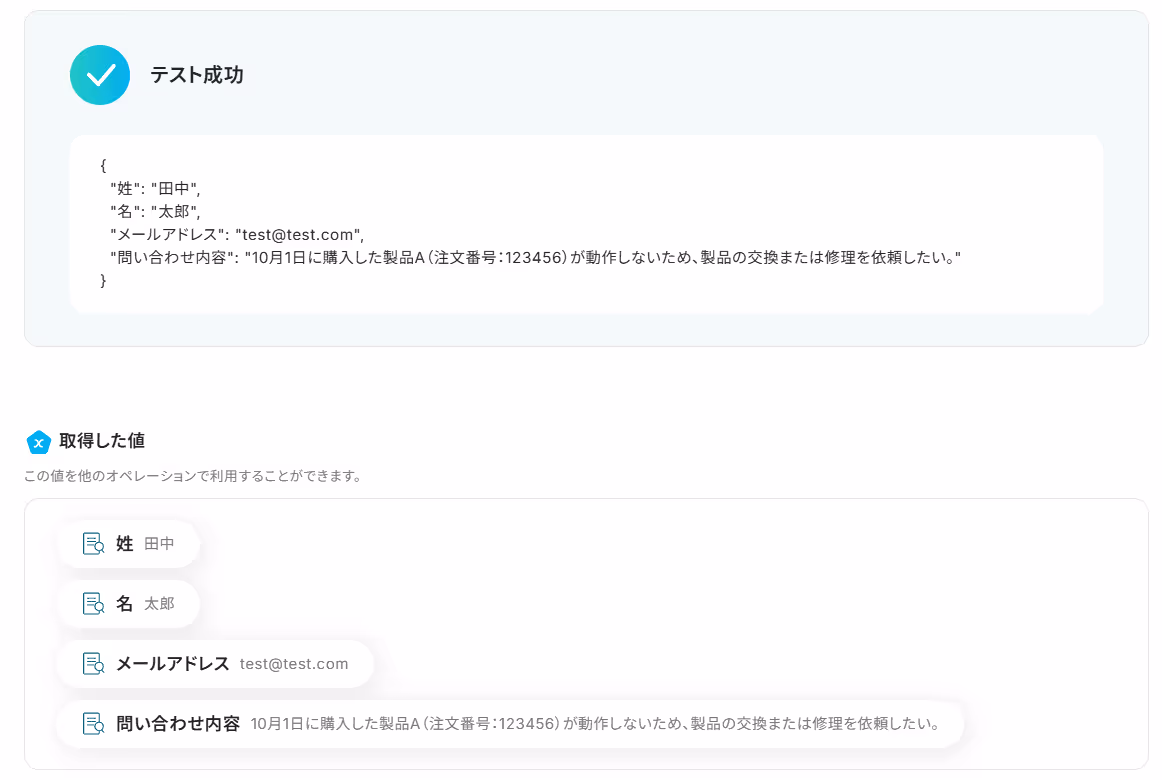 テストに成功すると「取得した値」に反映されます。