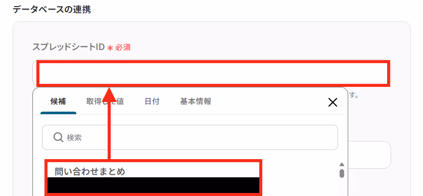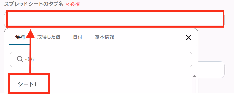 先ほど作成したGoogle スプレッドシートの「スプレッドシートID」と「スプレッドシートのタブ名」を候補から選択しましょう。