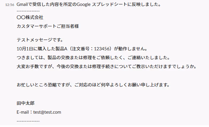 キーワードを含むテスト用のメールをGmailに送信しましょう。