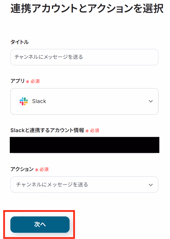 タイトルと連携するアカウント情報を確認し、アクションはテンプレート通りのまま「次へ」をクリックして進んでください。