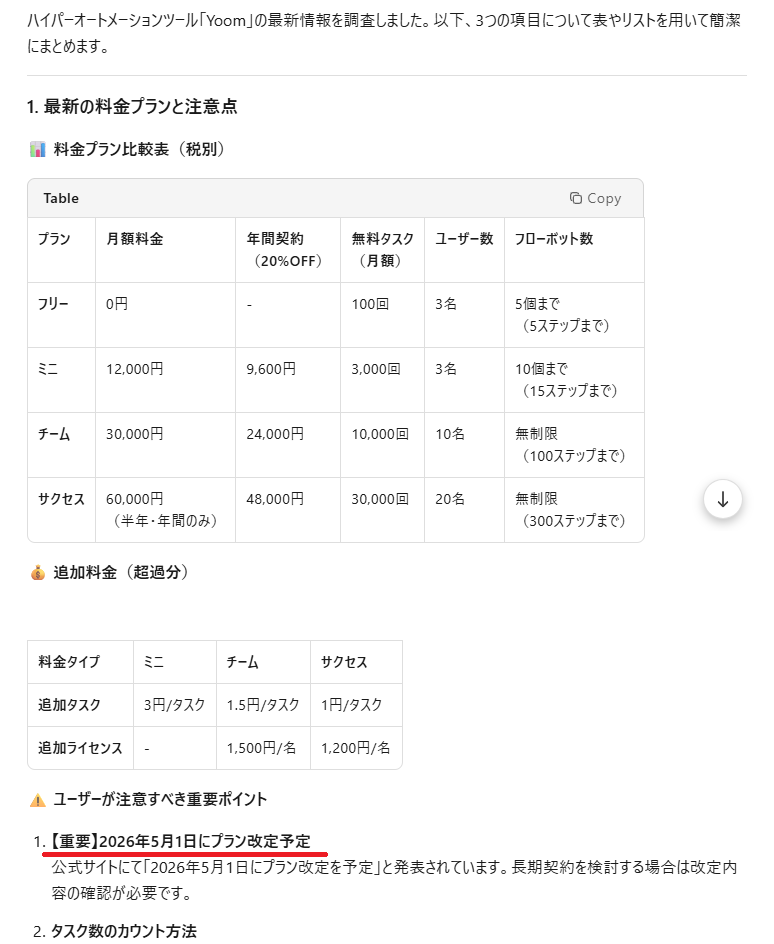 次に、情報の更新が早い「最新料金プラン」と「導入時の注意点」について、Web検索機能を活用してリサーチさせました。