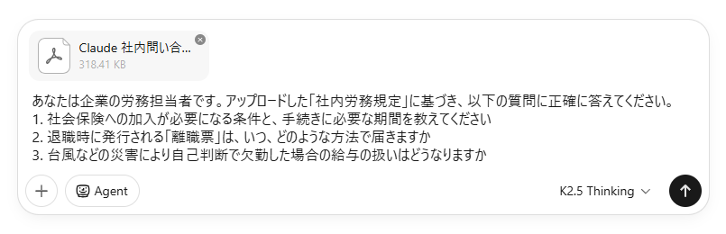 Kimi AIがどれほど正確に長大なドキュメントを理解できるか、提供した「社内労務規定」を読み込ませて検証しました。