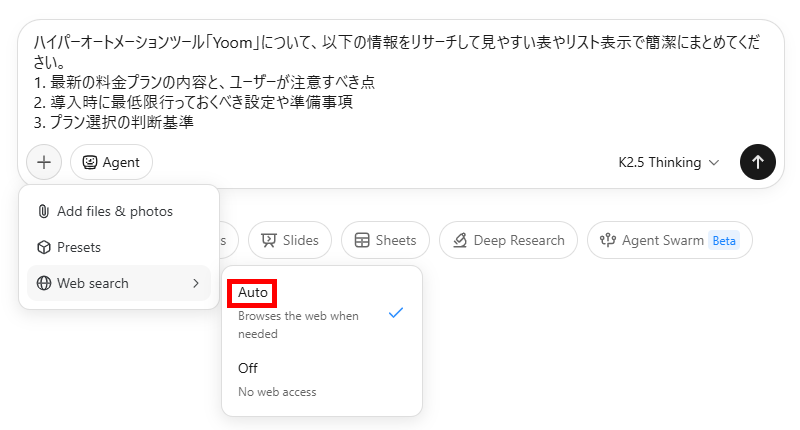 単なるテキスト生成に留まらず、Web上の最新情報を収集する能力もKimi AIが選ばれる理由の1つです。