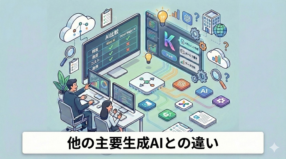 主要なAIツールであるChatGPTやClaudeと比較した場合、Kimi AIの最大のアドバンテージはやはり「長文処理の継続性」と「リサーチの深さ」にあります。