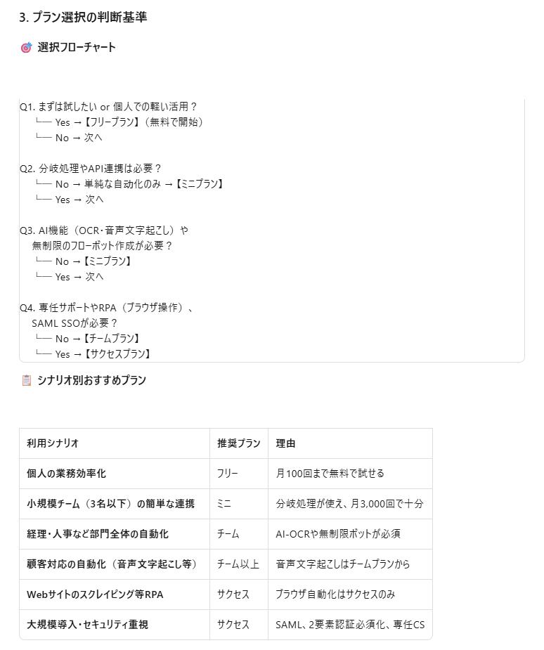 さらに、プラン選択の基準についても、簡単な指示だけで詳細なフローチャートやシナリオ別のおすすめを構築しています。