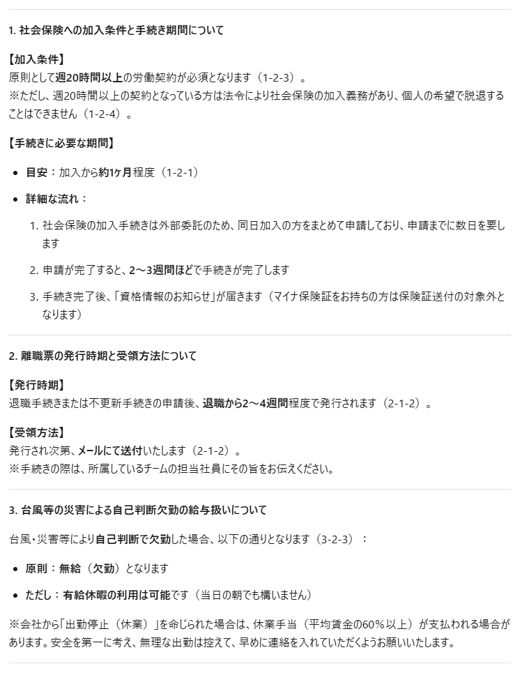 さらに、判断に迷いが生じやすい台風時の欠勤扱いについても「原則無給だが有給休暇の利用は可能」と、規定に基づいた論理的な回答を返しました。