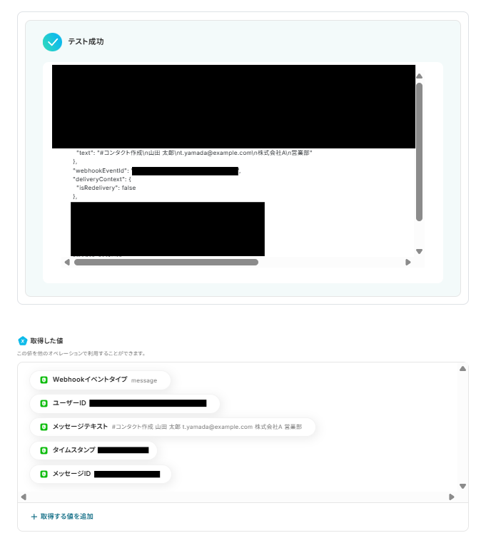 設定ができたら実際にLINE公式アカウントでHarvestで作成したいContactの情報を送信し、Yoomの画面で「テスト」をクリックします。