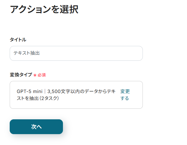 ※会社名、電話番号なども入力したい場合、「ステップ5:テキストを抽出する」で、抽出する値に「会社名」「電話番号」を設定しましょう。