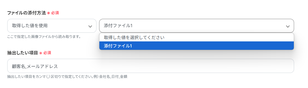 「ファイルの添付方法」はデフォルトで、先ほど添付したファイルが対象になっています。特にこだわりがなければこのままで大丈夫です! 「抽出したい項目」は、抽出したい項目を入力します。今回は以下の画像のように入力しました!