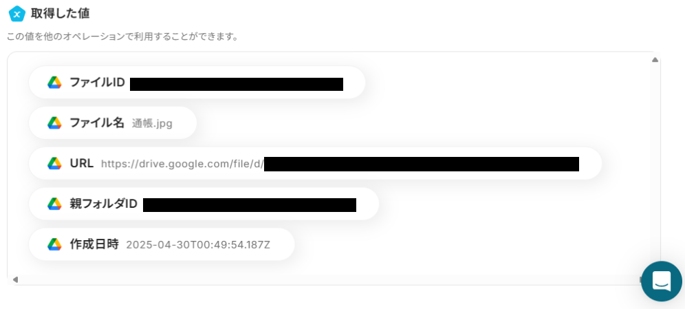 入力が完了したら、「テスト」を実行してみましょう。 テストが成功すると、下記のようなアウトプット が表示されます。 Google Driveに保存した通帳の画像ファイル名が反映していればOKです! 最後に、「保存する」を押して次のステップへ進みましょう。