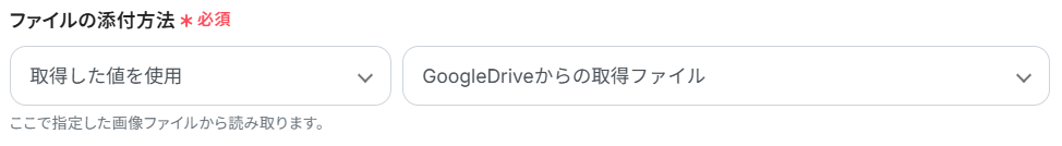 ファイルの添付方法:Google Driveからダウンロードしたファイルを取得したいので、下記のように設定しましょう。