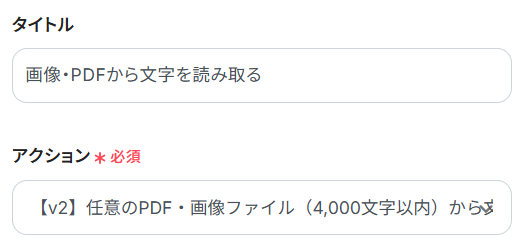 2.アクションを選択 「タイトル」と「アクション」を任意で編集してください。 「アクション」は、デフォルトで「【V2】任意のPDF・画像ファイル(4,000文字以内)から文字情報を読み取る(5タスク)」が選択されていますので、変更せずそのままで大丈夫です。 設定が完了したら、「次へ」をクリックしてください。