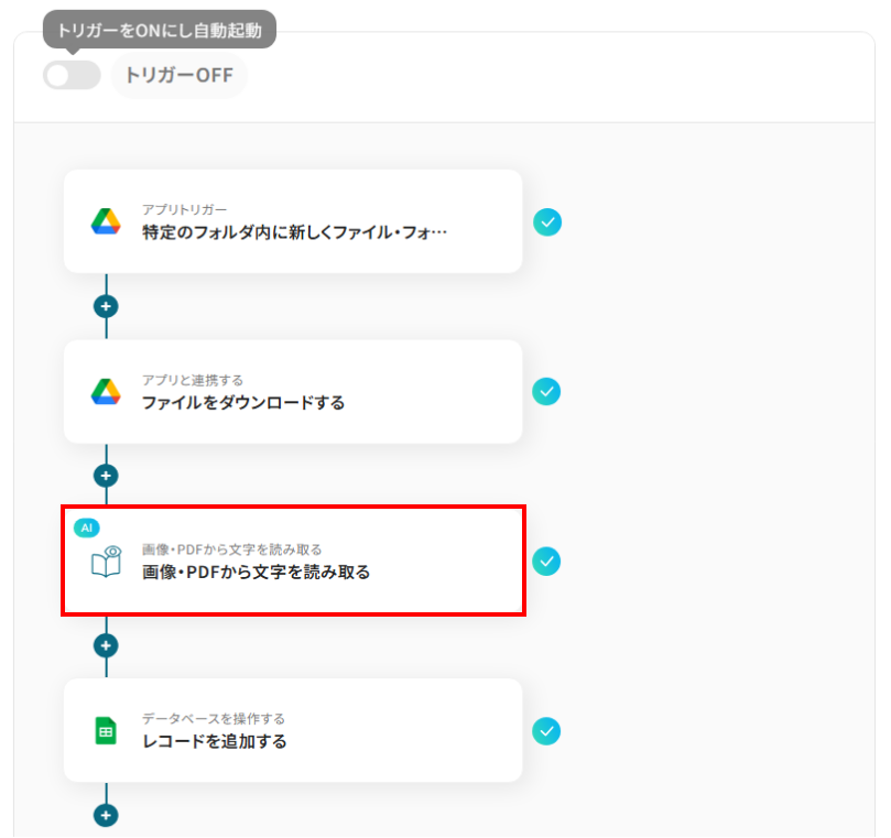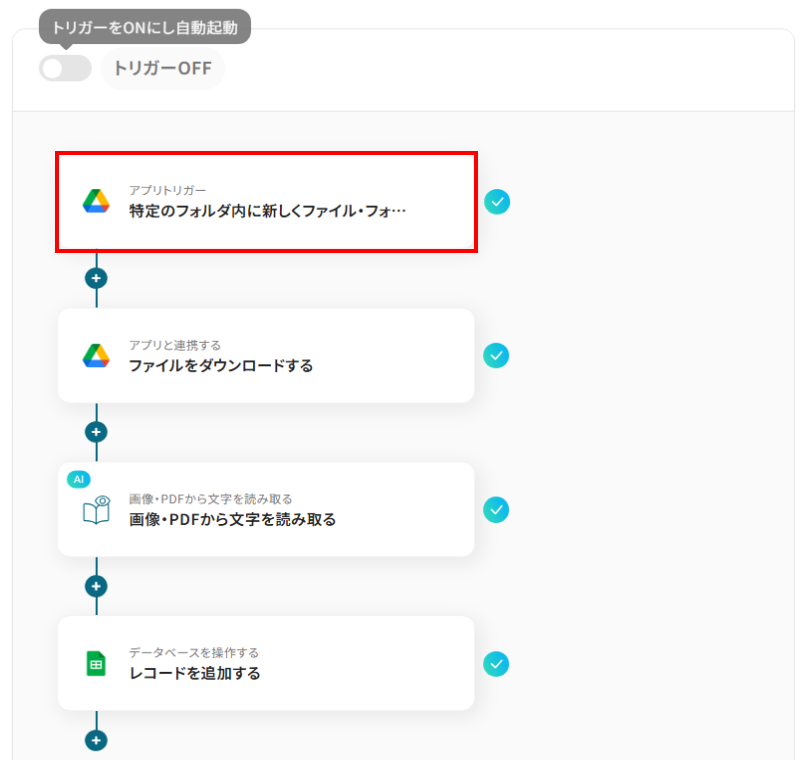 Google Driveのトリガー設定、OCR処理、Google スプレッドシートへのアクション設定