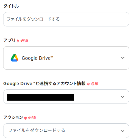 2.連携アカウントとアクションを選択 タイトルとアカウント情報はステップ1で設定した内容が入力されています。 トリガーアクションは、テンプレート通りに「ファイルをダウンロードする」のままで大丈夫です。 「次へ」をクリックして進んでください。