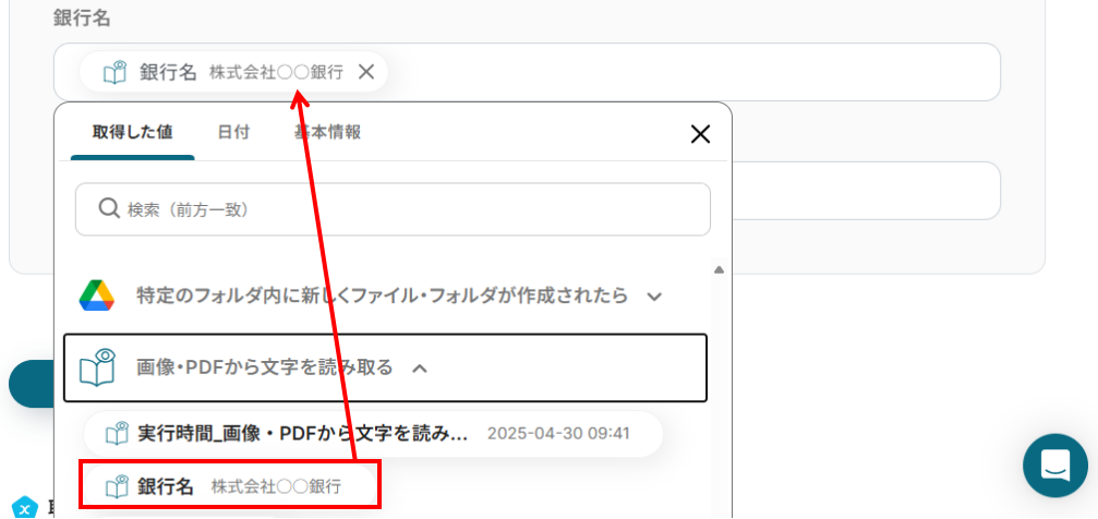 4.データベース操作の詳細設定 ここでは、Google スプレッドシートファイルのどの項目に、AIで抽出したデータを入力するか設定していきます。 各入力欄をクリックすると、下記のようなアウトプットが表示されますので、各項目に合わせて選択してください。