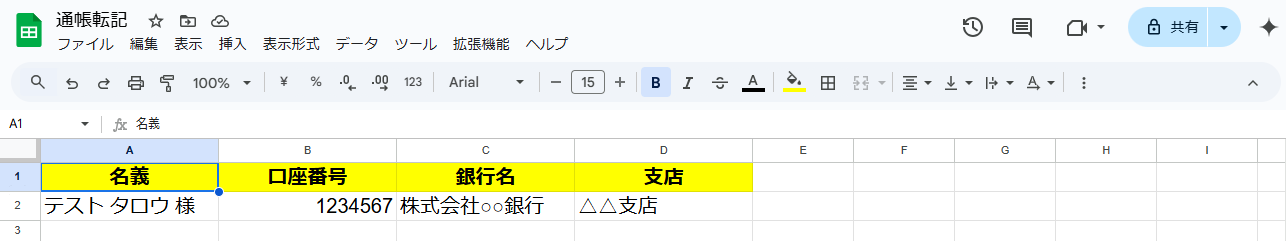 なお、この後のテスト操作のため、フォルダに通帳の画像を保存する必要があります。テスト用に下記のような通帳の画像を準備したので、これをGoogle Driveのフォルダに保存しました。