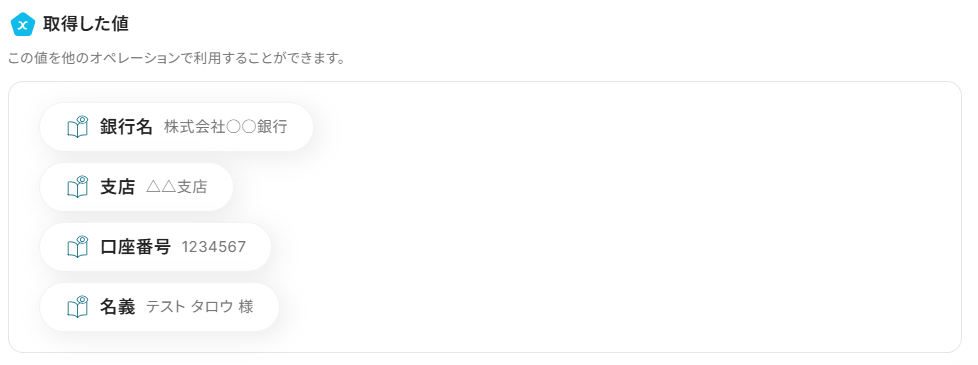 入力が完了したら、「テスト」を実行してみましょう。 テストが成功すると、下記のようなアウトプットが表示されます。 通帳の内容から、指定した文字が抽出されていればOKです! 最後に、「保存する」を押して次のステップへ進みましょう。