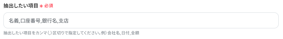 抽出したい項目:画像から抽出したい項目を設定しましょう。お好みに合わせて、カンマ(,)区切りで入力しましょう。