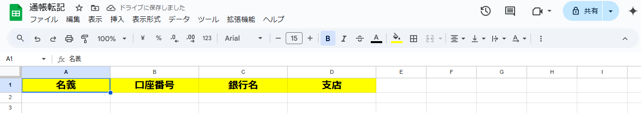 3.データベースの連携 まだ、レコードの追加先であるGoogle スプレッドシートのファイルを準備していない場合は、このタイミングで作成してください。 今回は、下記のような項目を入力したファイルを作成しました!