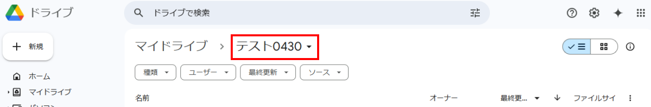 3.アプリトリガーのAPI接続設定 ここでは、トリガーとなるGoogle Driveのフォルダを設定します。 まだ、レシートを保存するGoogle Driveのフォルダを準備していない場合は、このタイミングで作成してください。 今回は、下記のような赤枠のフォルダを作成しました。