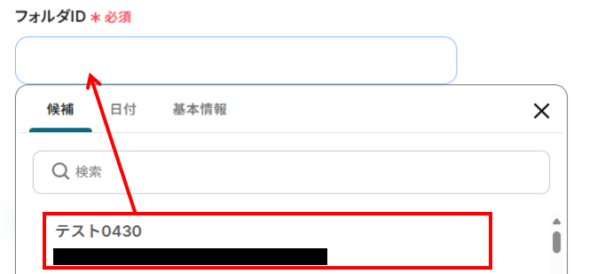 フォルダID:入力欄をクリックすると、下記のような候補が表示されます。先ほど作成したGoogle Driveのフォルダを選択してください。